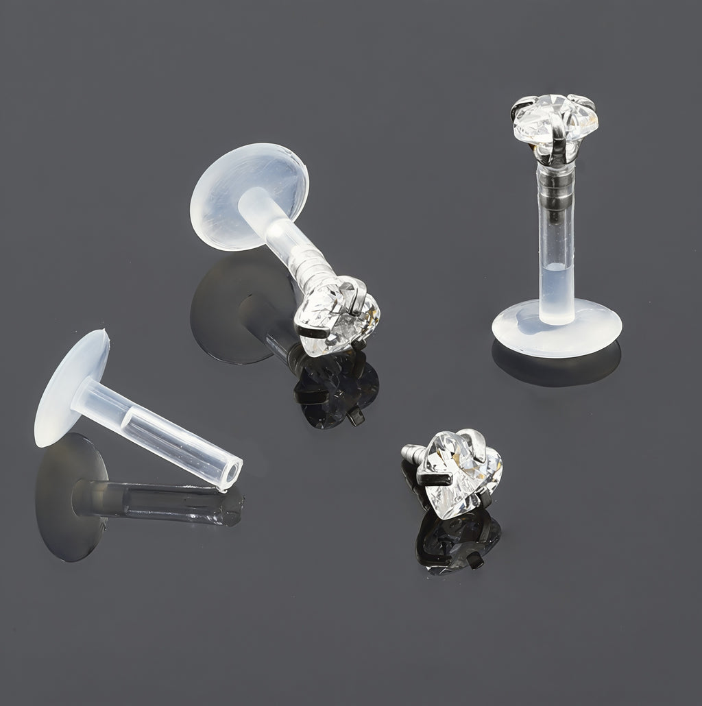 Push-in System mit Bioflex Labret und Steel 316L Aufsatz mit 4mm Kristall in Herz Design in Krabbenfassung. Erhältlich in Stärke 1.2mm und Länge 8mm. Ideal zum Wiederverkauf und zur Kombination mit anderem Push-in Zubehör der selben Stärke.