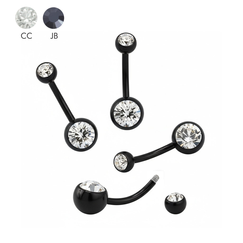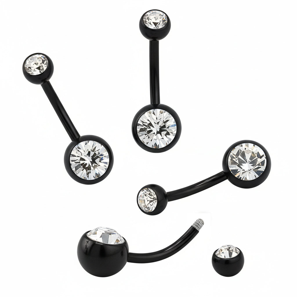 Steel 316L Bauchnabel Banana mit 5+8mm Kugeln, 2 Kristallen und schwarzer PVD Titan Beschichtung in verschiedenen SONDERLÄNGEN. Ideal für den Ersteinsatz, zum Wiederverkauf oder zur Kombination mit anderem Schraubzubehör der selben Stärke.