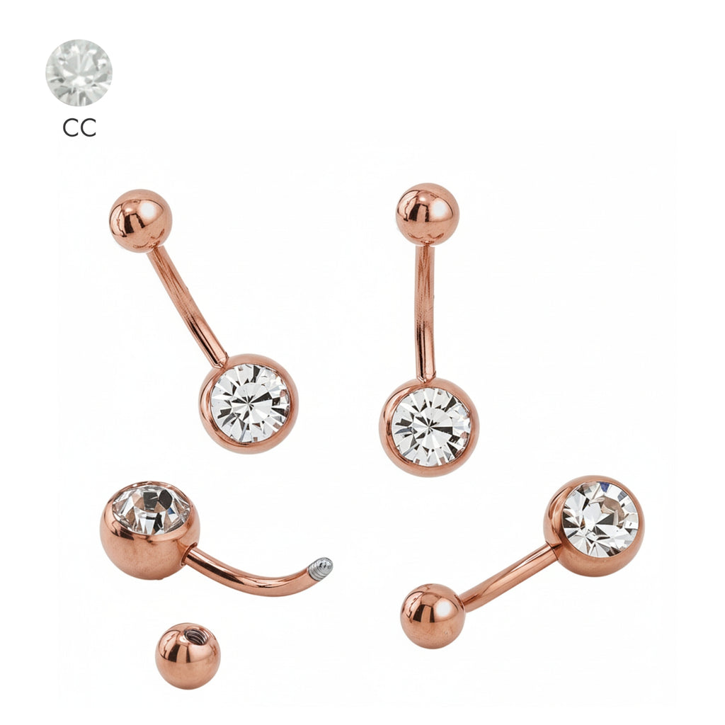 Steel 316L Bauchnabel Banana mit 5+8mm Kugeln mit einem Kristall in CC Kristallklar und einer 18K Rose Gold PVD Titan Beschichtung in verschiedenen SONDERLÄNGEN. Ideal für den Ersteinsatz, zum Wiederverkauf oder zur Kombination mit anderem Schraubzubehör der selben Stärke